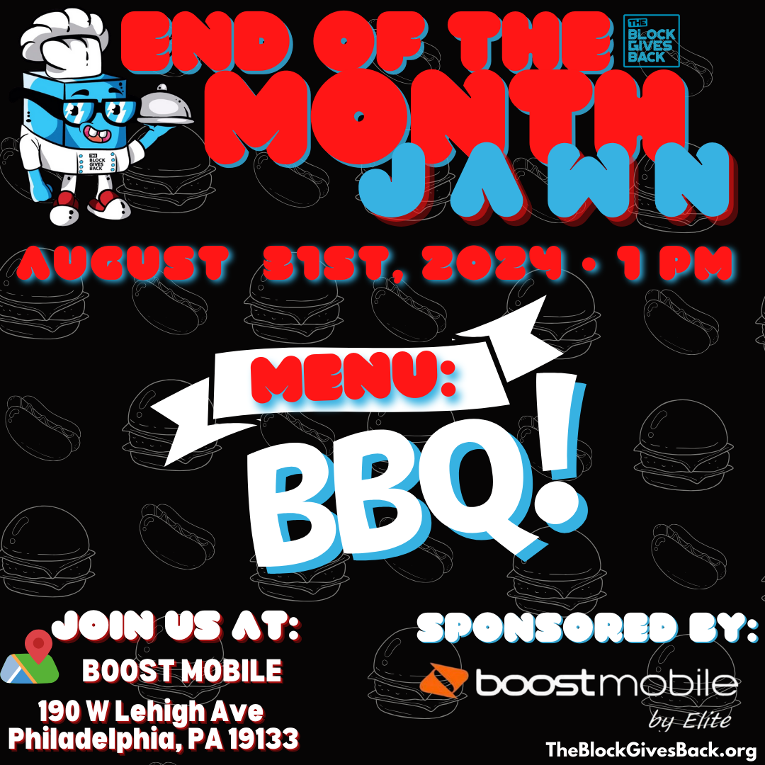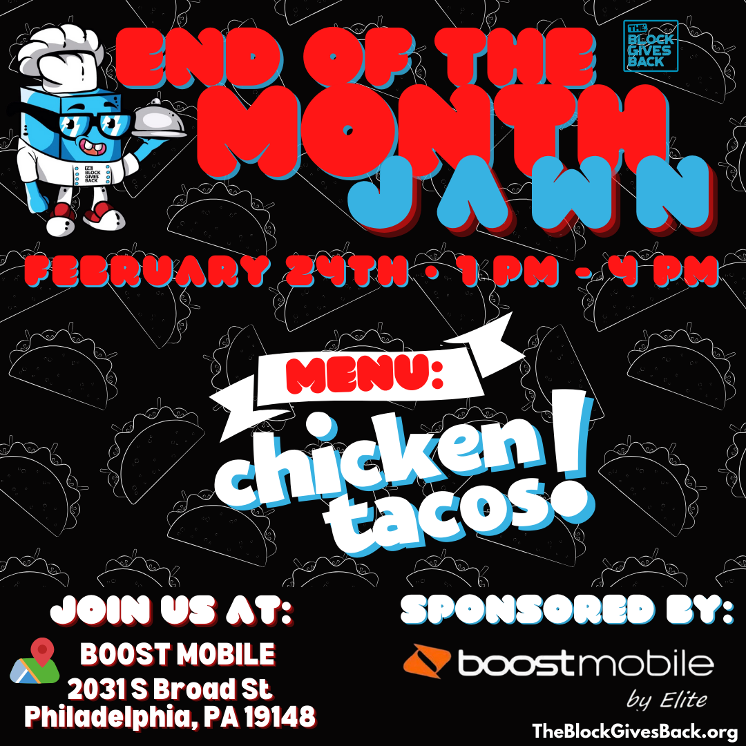 The End of the Month Jawn is hosted the last Saturday of each month. TBGB is grateful for our sponsor Boost Mobile that makes it possible to continue this event adventure! We are running it back to their S. Broad location offering chicken tacos to all who come by until we run out. No matter what side of the table you’re on, we are happy you’re there! Prep will begin at 1 PM, and meals will be distributed as they’re ready! Hope to see you there!